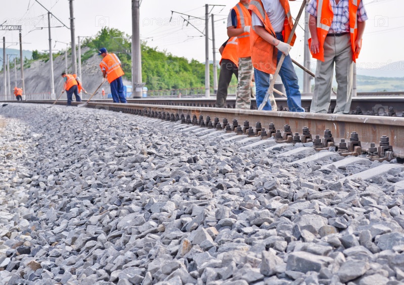 Рабочие в оранжевых жилетах на железнодорожной насыпи