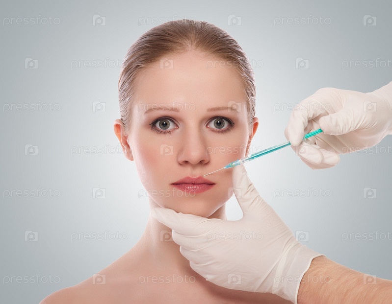 Косметическая инъекция ботокса в губы женщины на сером фоне