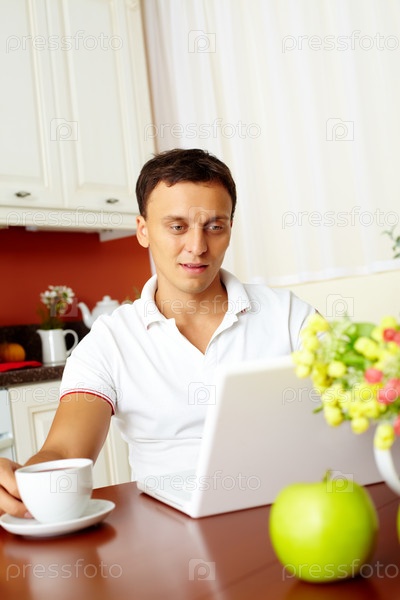 Молодой мужчина пьет чай на кухне и смотрит в ноутбук
