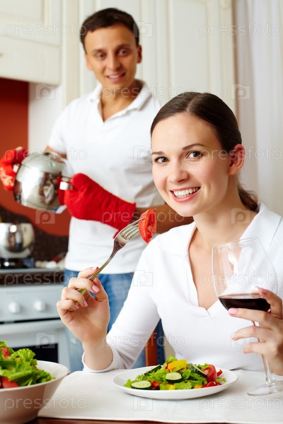 Женщина ест салат на кухне, ее муж стоит у плиты на заднем плане