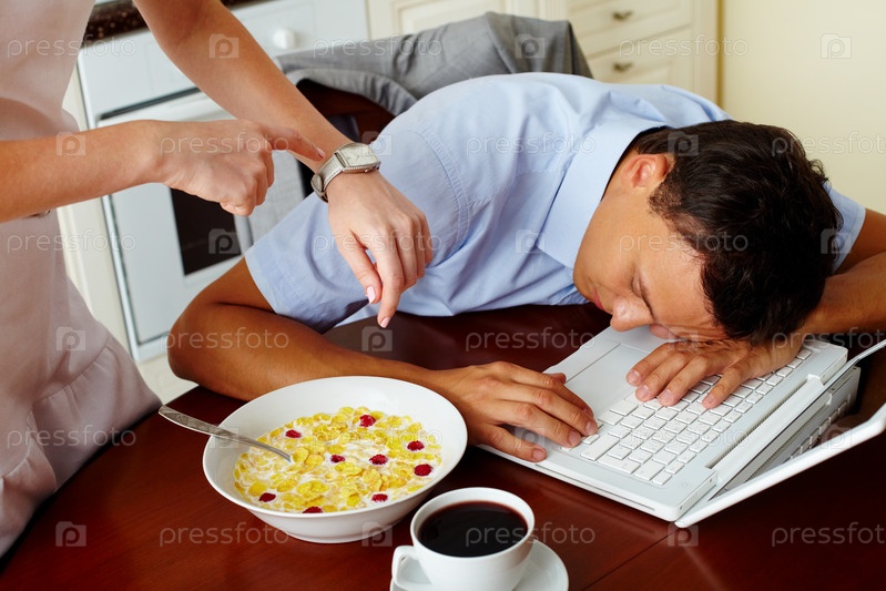 Мужчина уснул на кухне за ноутбуком. Рядом стоит женщина и указывает на часы