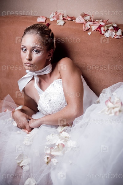 Невеста лежит на диване, осыпанная лепестками роз