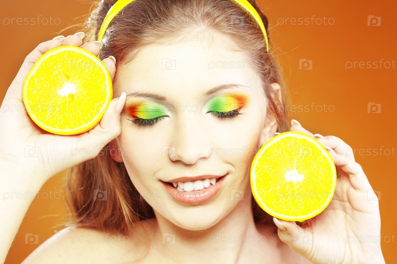 Девушка с ярко-оранжевым макияжем в студии