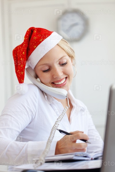 Деловая женщина в шапке Санта-Клауса говорит по телефону в офисе