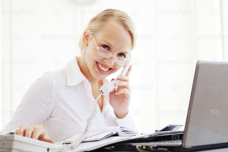 Улыбающаяся деловая женщина работает в офисе