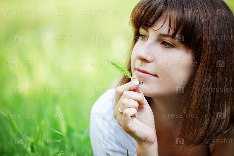 Симпатичная девушка лежит на газоне