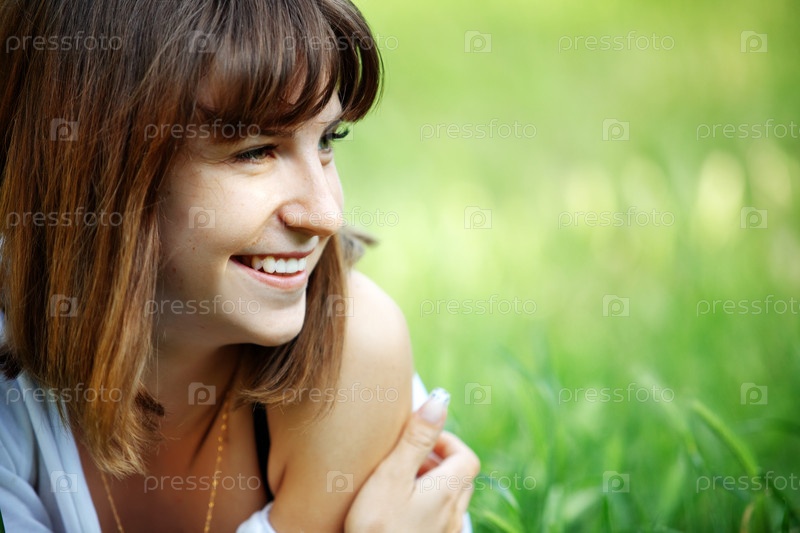 Симпатичная девушка лежит на газоне