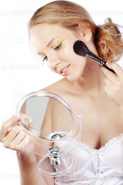 Красивая девушка пудрит лицо перед зеркалом