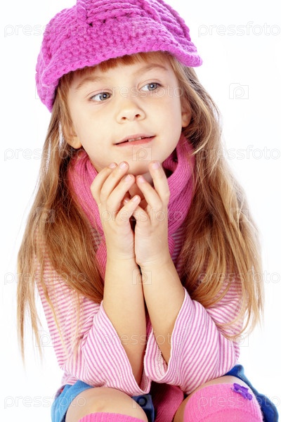 Маленькая девочка в модной одежды на белом фоне