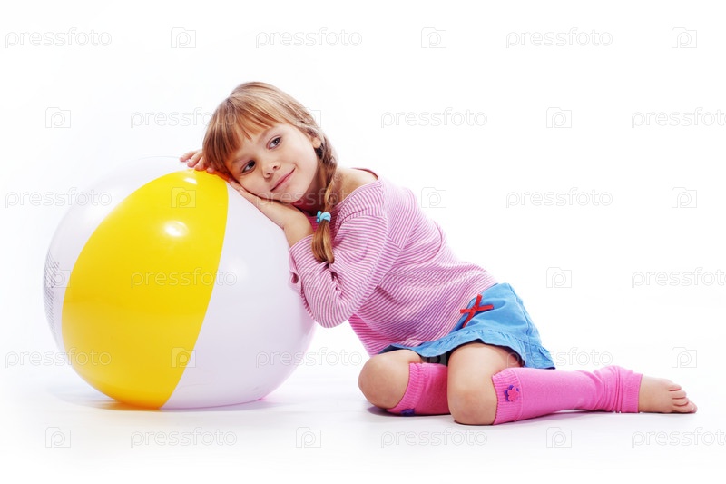 Девушка с надувным мячом на белом фоне