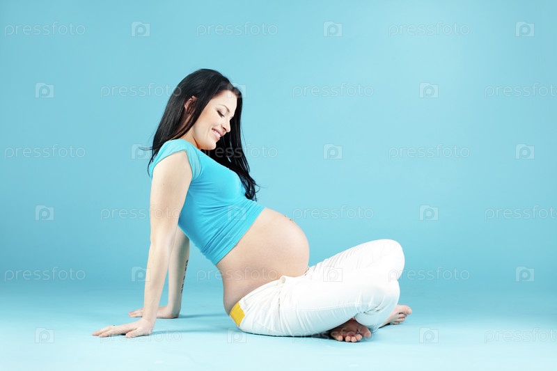 Портрет беременной девушки на синем фоне