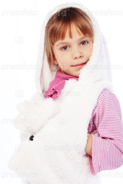 Милая девочка в теплой одежде на белом фоне