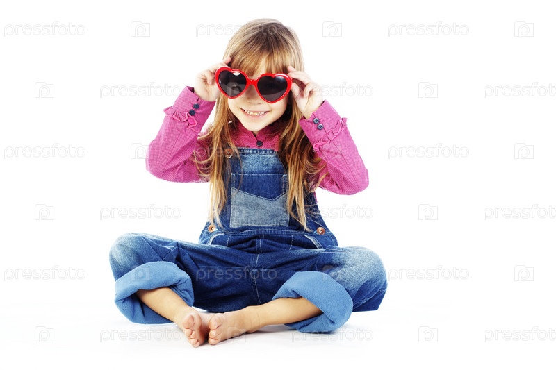 Маленькая девочка в солнечных очках, сидящая на белом фоне