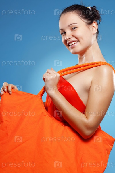 Улыбающаяся брюнетка с оранжевой сумкой на голубом фоне