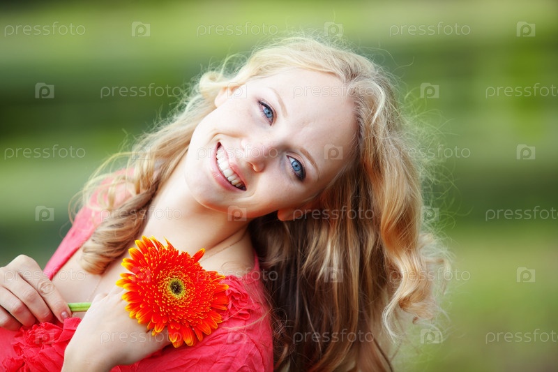 Красивая девушка с красным цветком на размытом фоне природы