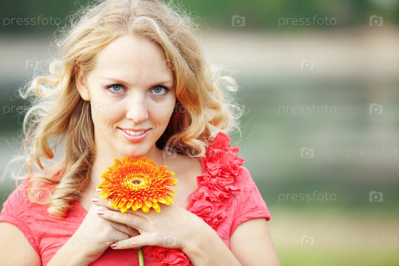 Красивая девушка с оранжевым цветком на размытом фоне природы