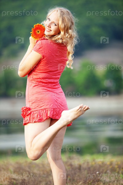 Красивая девушка с оранжевым цветком на природе