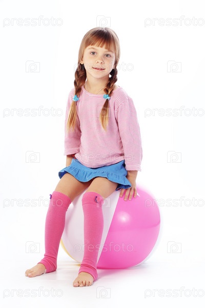 Маленькая девочка на мячике на белом фоне
