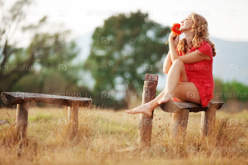 Молодая девушка с герберой в поле