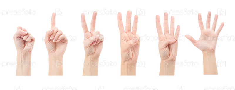 Женская рука с разным количеством показываемых пальцев на белом фоне