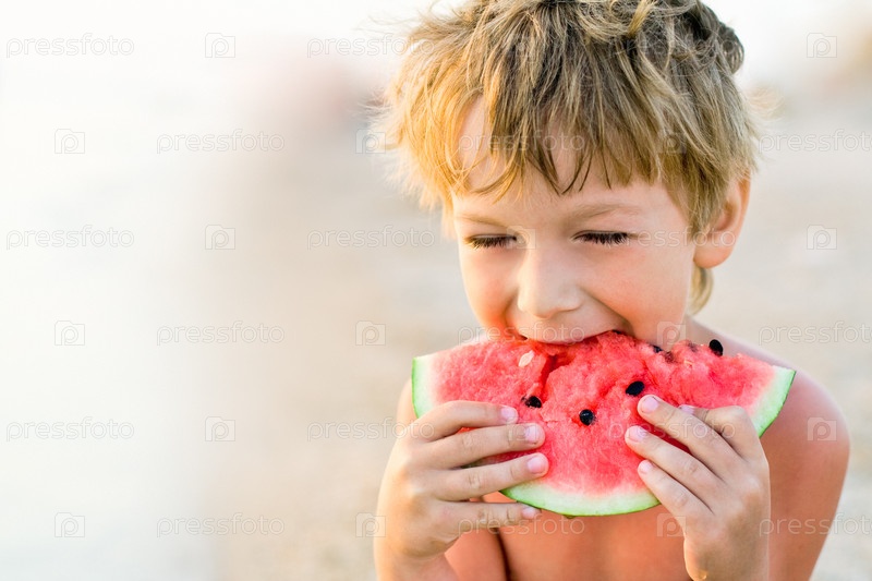 Мальчик кусает арбуз