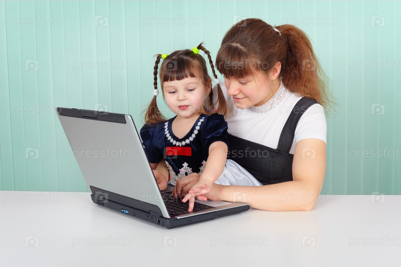 Мама показывает дочери работу на компьютере за столом
