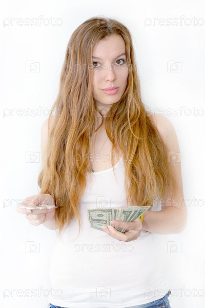 Рыжеволосая девушка с таблетками и долларами в руках на белом фоне