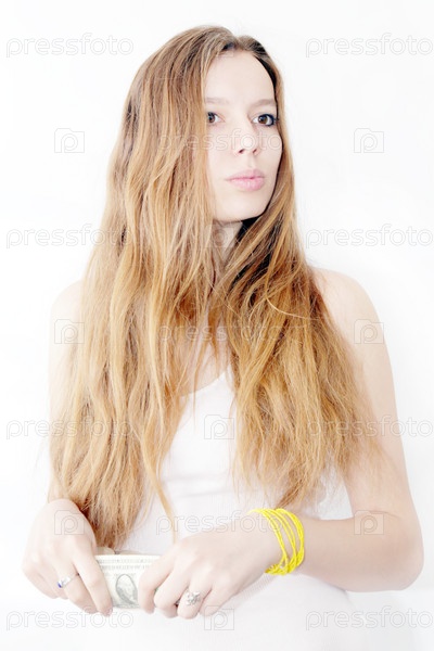 Рыжеволосая девушка с пачкой долларов на белом фоне