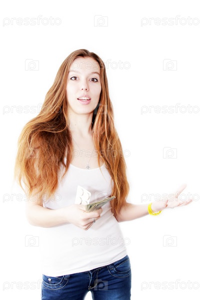 Рыжеволосая девушка с таблетками и долларами в руках на белом фоне
