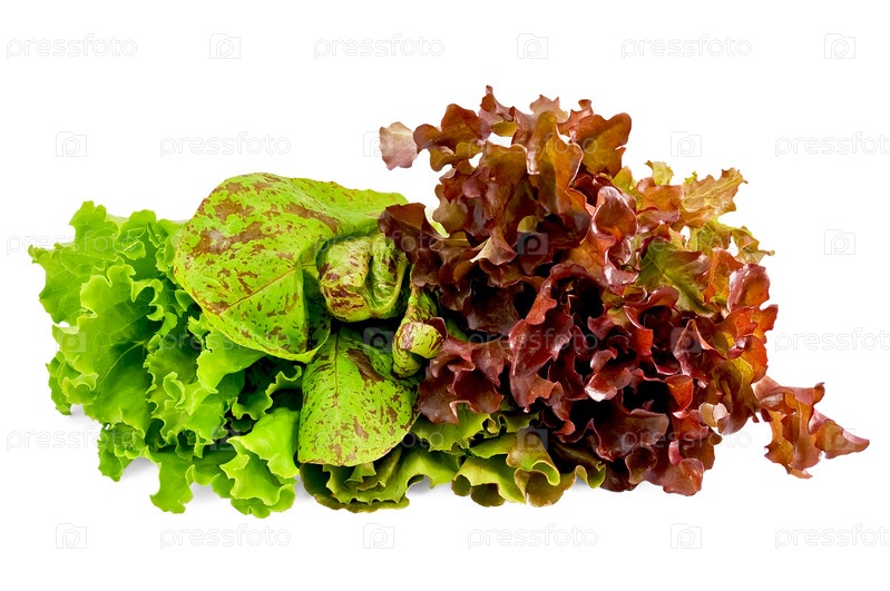 Три пучка зеленого, пятнистого и красного салата на белом фоне