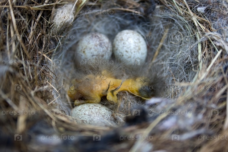 Только что вылупившийся птенец в гнезде