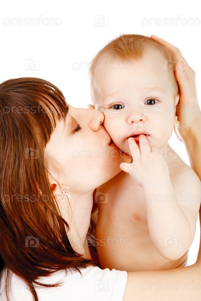 Счастливая мать с ребенком на белом фоне