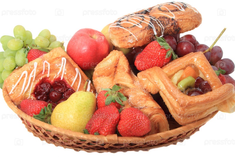Корзина с различными фруктами и пирожными, изолированна на белом фоне