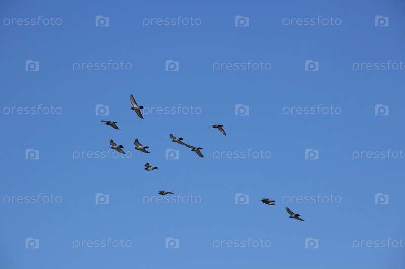 Стая голубей в голубом небе