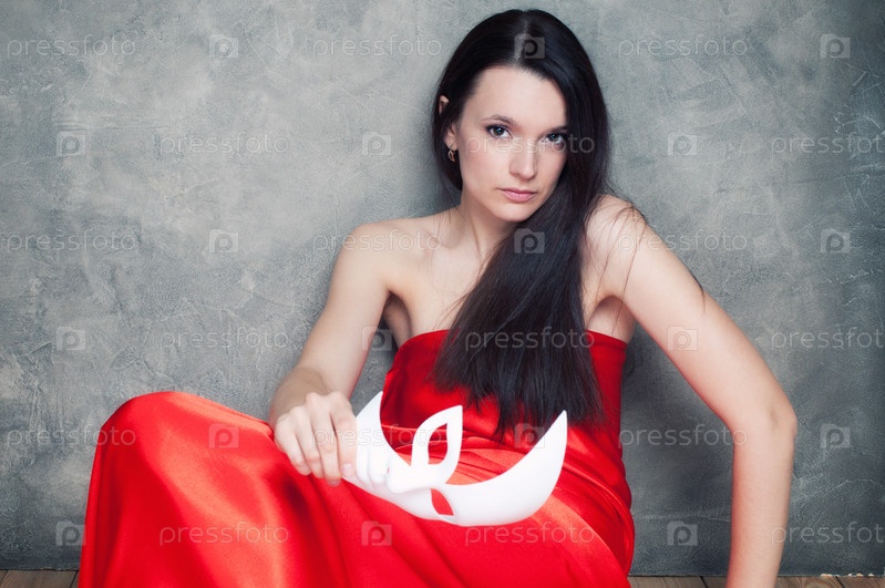 Элегантная молодая женщина с карнавальной маской сидит на полу