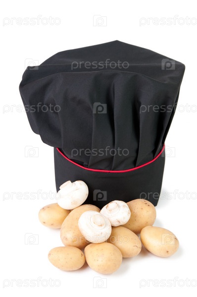 Картофель, шампиньоны и поварской колпак на белом фоне
