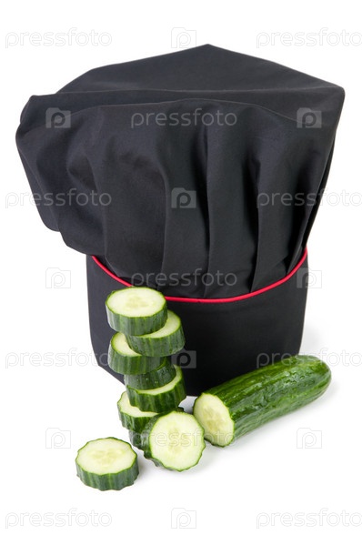 Колпак шеф-повара и свежий огурец, белый фон