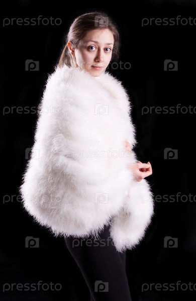Красивая темноволосая девушка в белой шубе, изолирована на черном фоне
