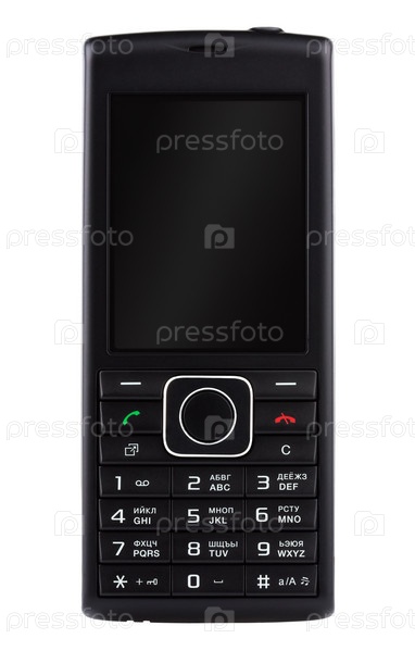 Черный мобильный телефон с кнопками, изолирован на белом фоне