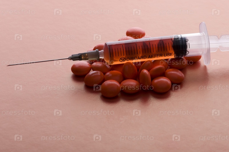 Объект на красном - Медицинские таблетки и шприц вблизи