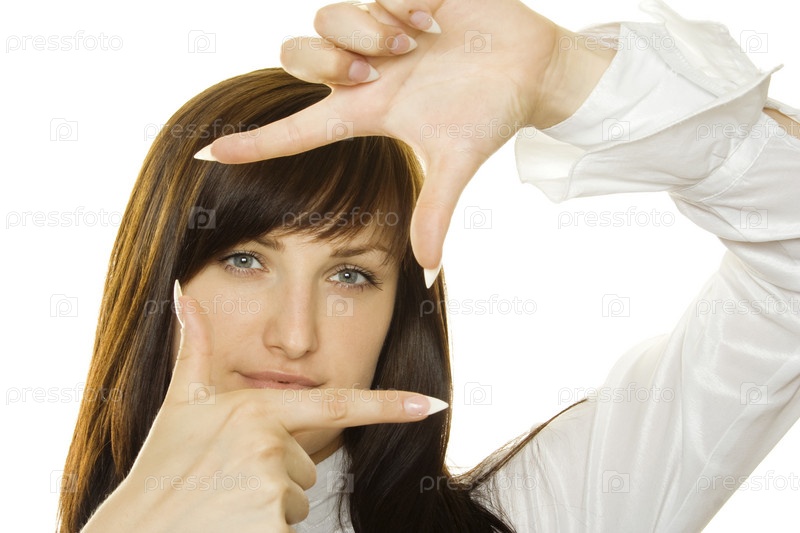 Девушка делает знак кадра на белом фоне