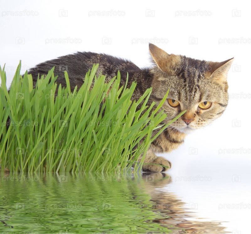 Британская кошка в траве на светлом фоне