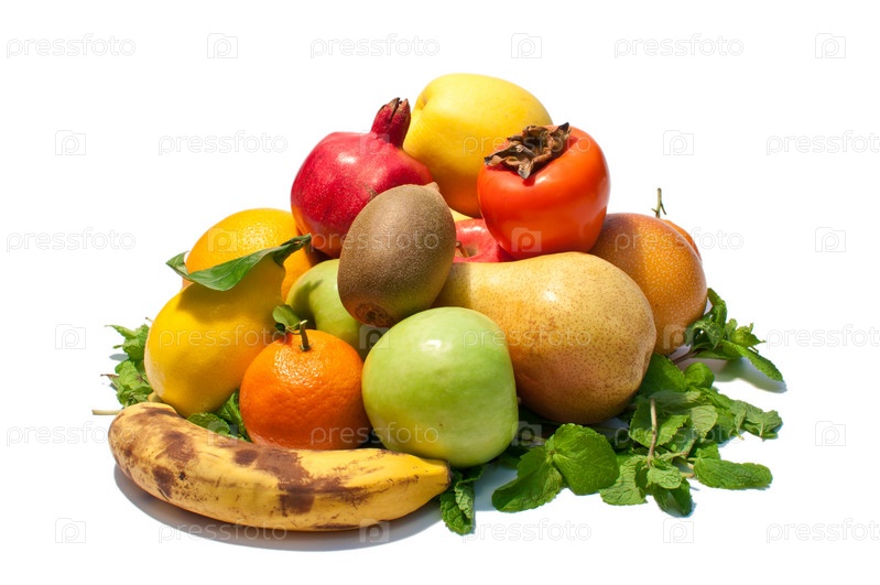 Разные фрукты с зелеными листьями на белом фоне