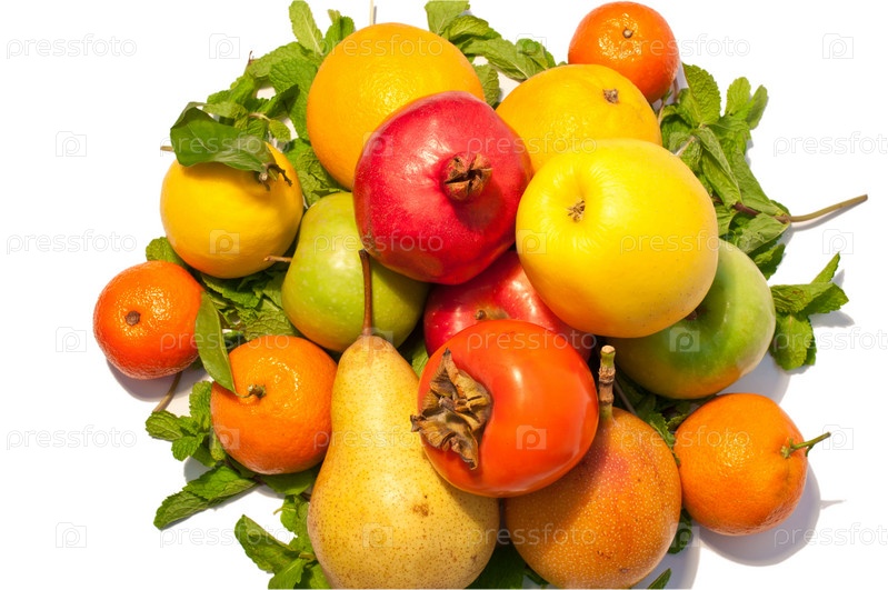 Разные фрукты с зелеными листьями на белом фоне