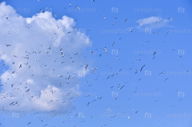Большая стая птиц в голубом небе