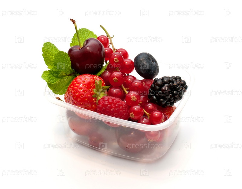 Ягоды в пластиковой коробке на белом фоне