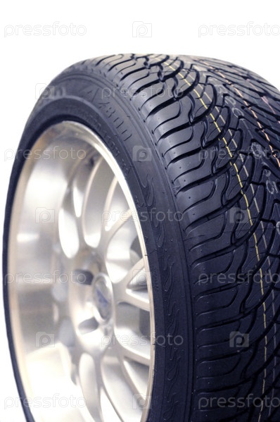 Автомобильное колесо с низкопрофильной шиной на белом фоне