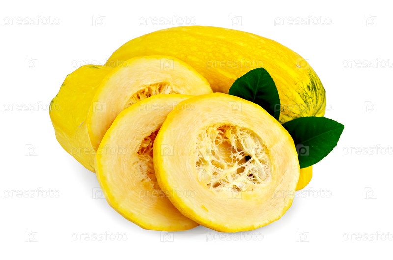 Желтый спелый кабачок, разрезанный на части, с двумя зелеными листьями лимона, изолировано на белом фоне