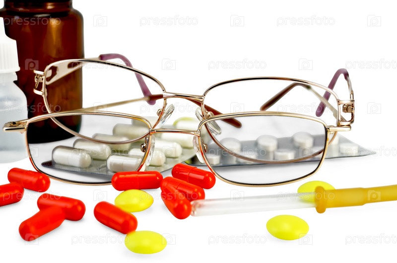 Две пары очков, красные и белые капсулы, желтые таблетки, две баночки с лекарствами, пипетка, изолировано на белом фоне
