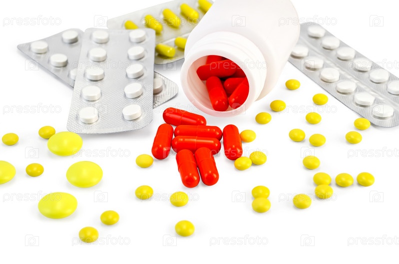 Капсулы красные в баночке, капсулы желтые, таблетки белые и желтые, изолировано на белом фоне